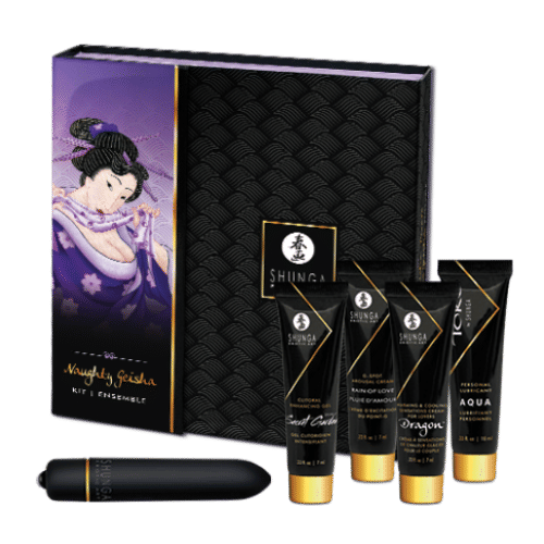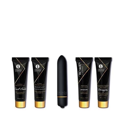 Explore your Naughty Side. This collection of miniature products will help you explore and break all taboos. Nothing surpasses the desire to discover the lust of flesh by yourself or with your lover. Collection includes: Toko aqua personal lubricant, Secret Garden clitoral enhancing gel, Dragon warming and cooling sensations cream, Rain of Love G-spot arousal cream, 10 speed vibrating bullet ( requires 1 AAA battery – not included)